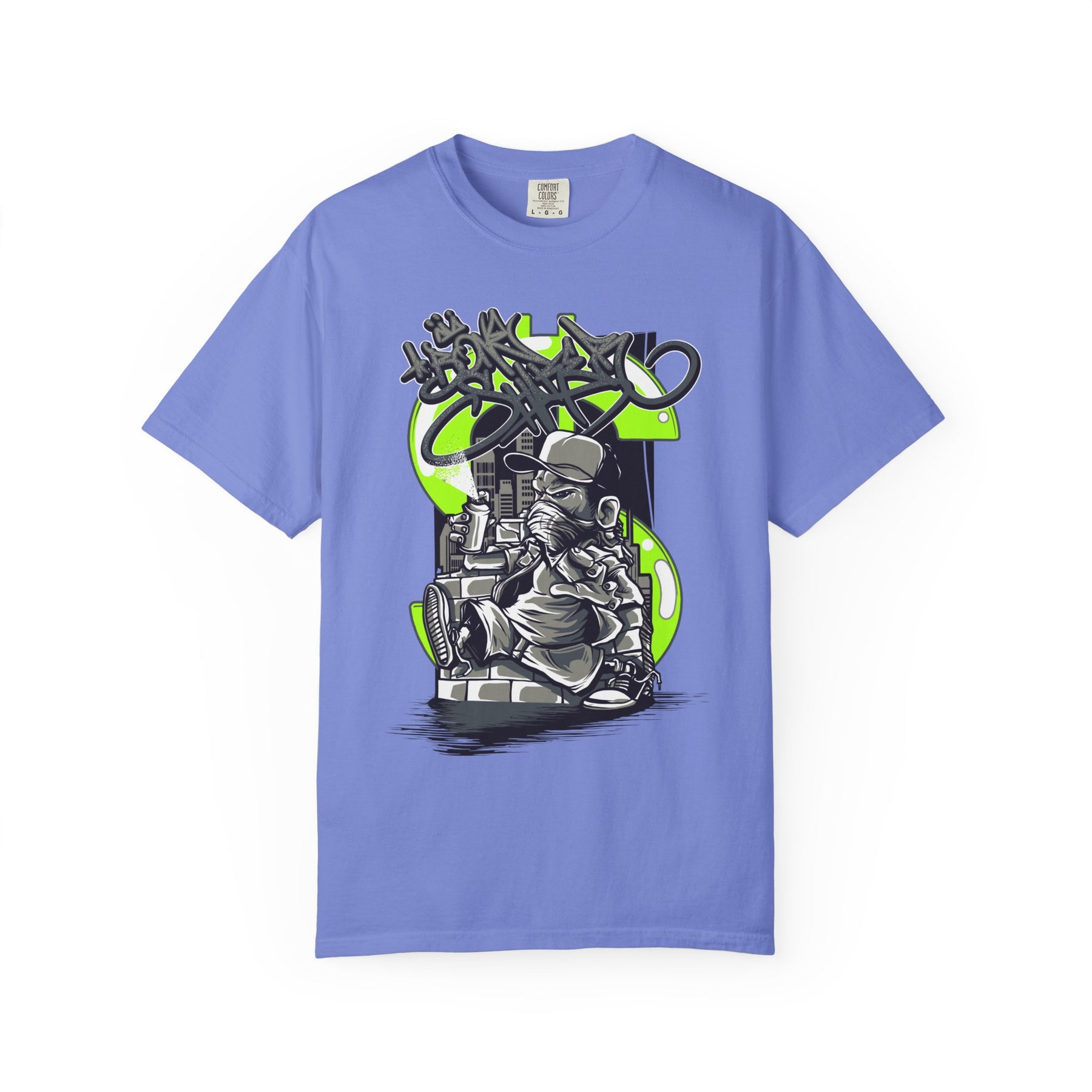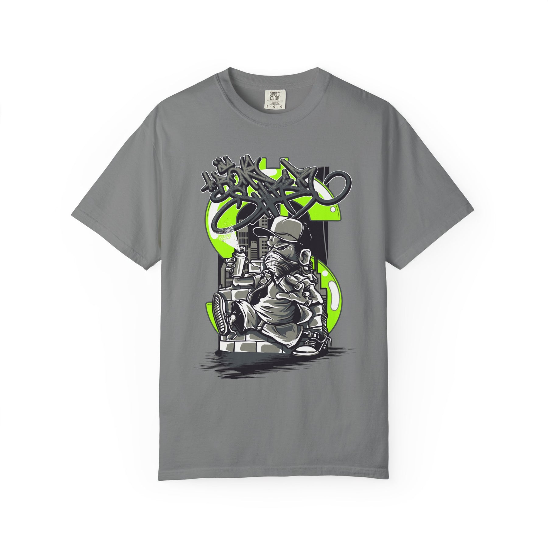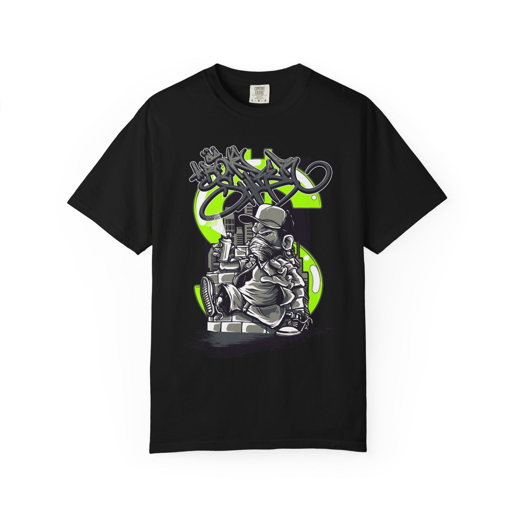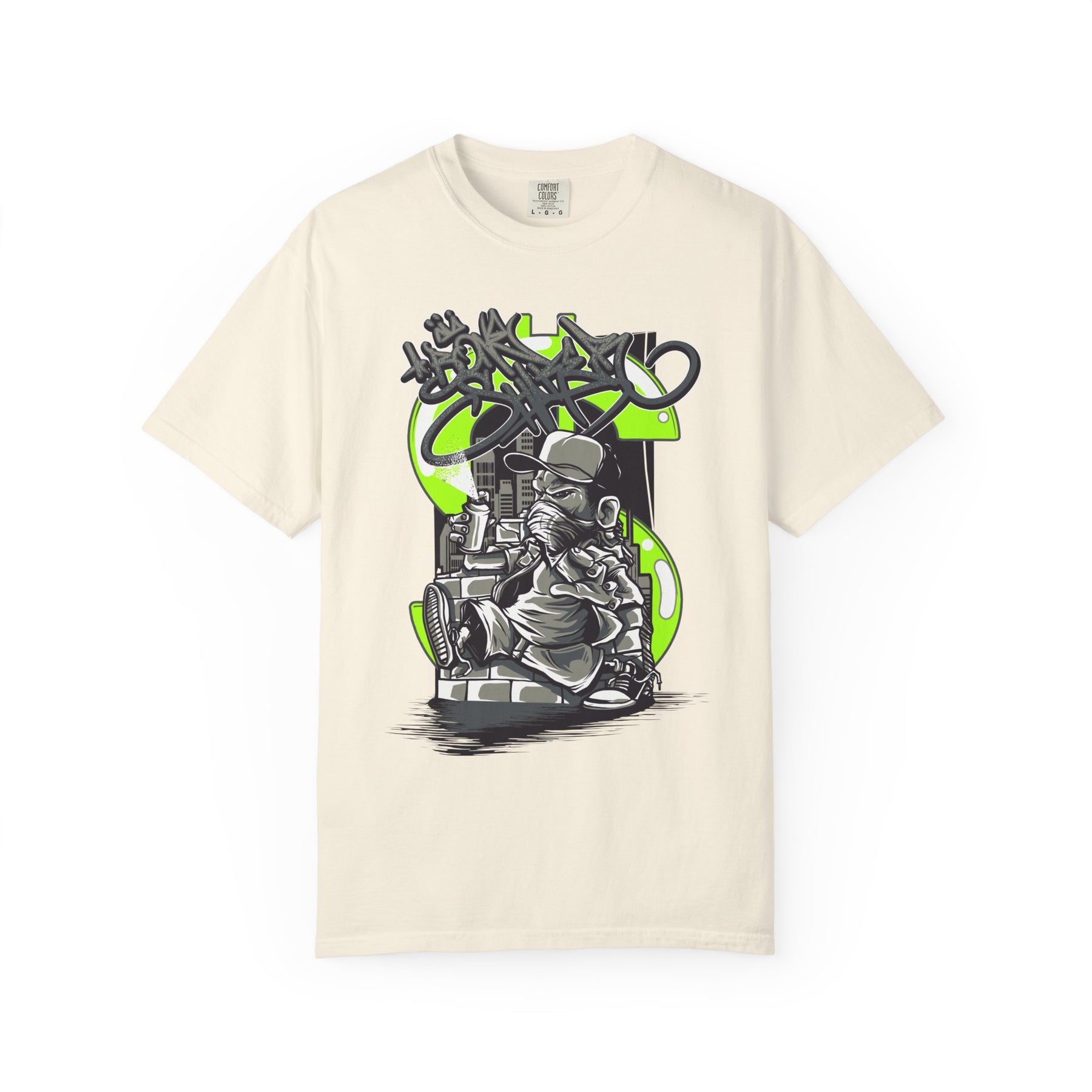 This heavyweight, garment-dyed tee carries a raw, streetwise energy — a worn-in canvas for bold graffiti-style artwork. The front shows a detailed urban character with a vintage camera and layered tag elements in high-contrast ink and neon green accents. It feels lived-in and tactile: softened by the dye process, relaxed in fit, and built to take repeated wear without losing shape. Wear it to skateparks, late-night photo runs, mural walks, or any day you want your style to read like a snapshot from the streets.